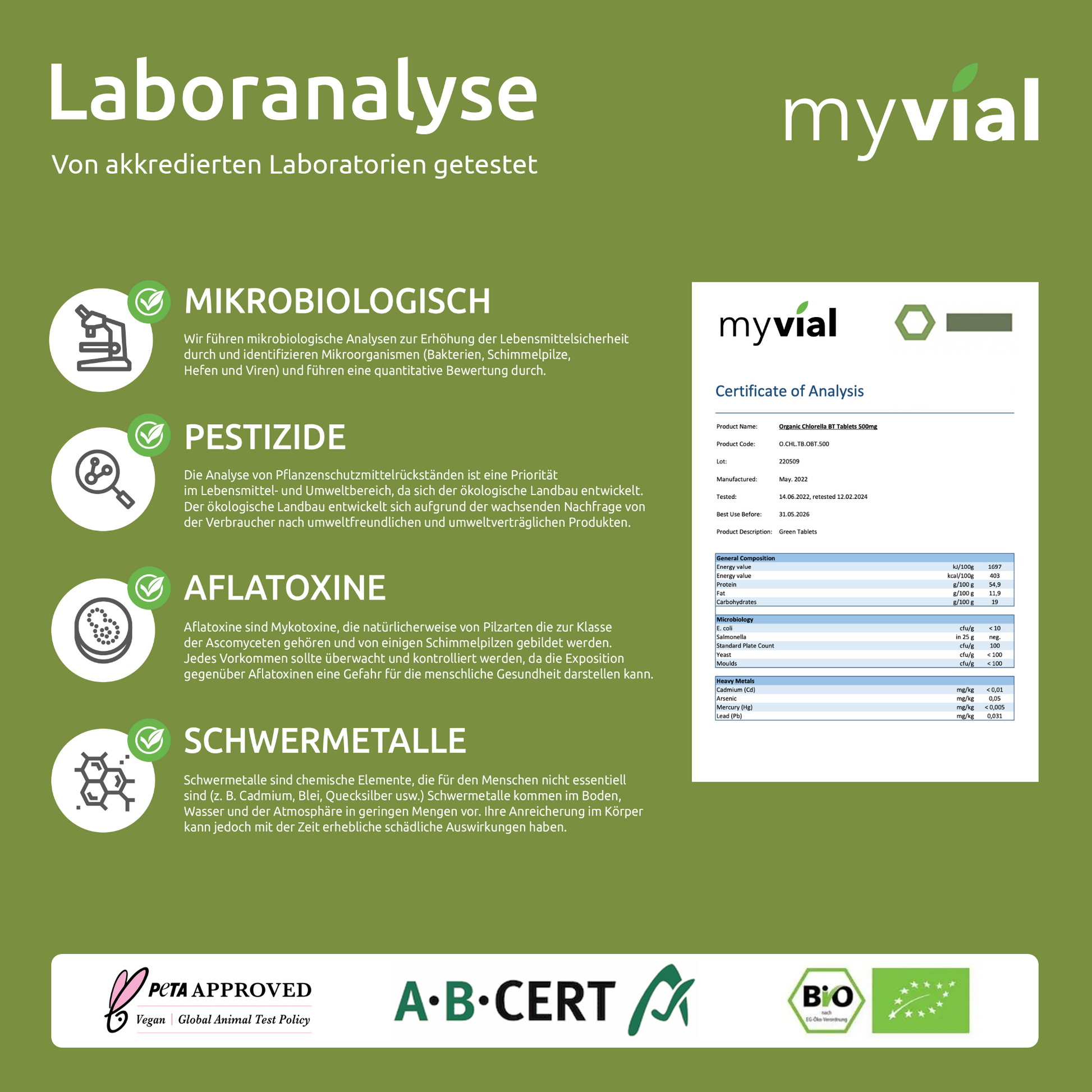 ✔ Pro Pressling: 500 mg reines Bio Chlorella Pulver aus kontrolliert biologischem Anbau.