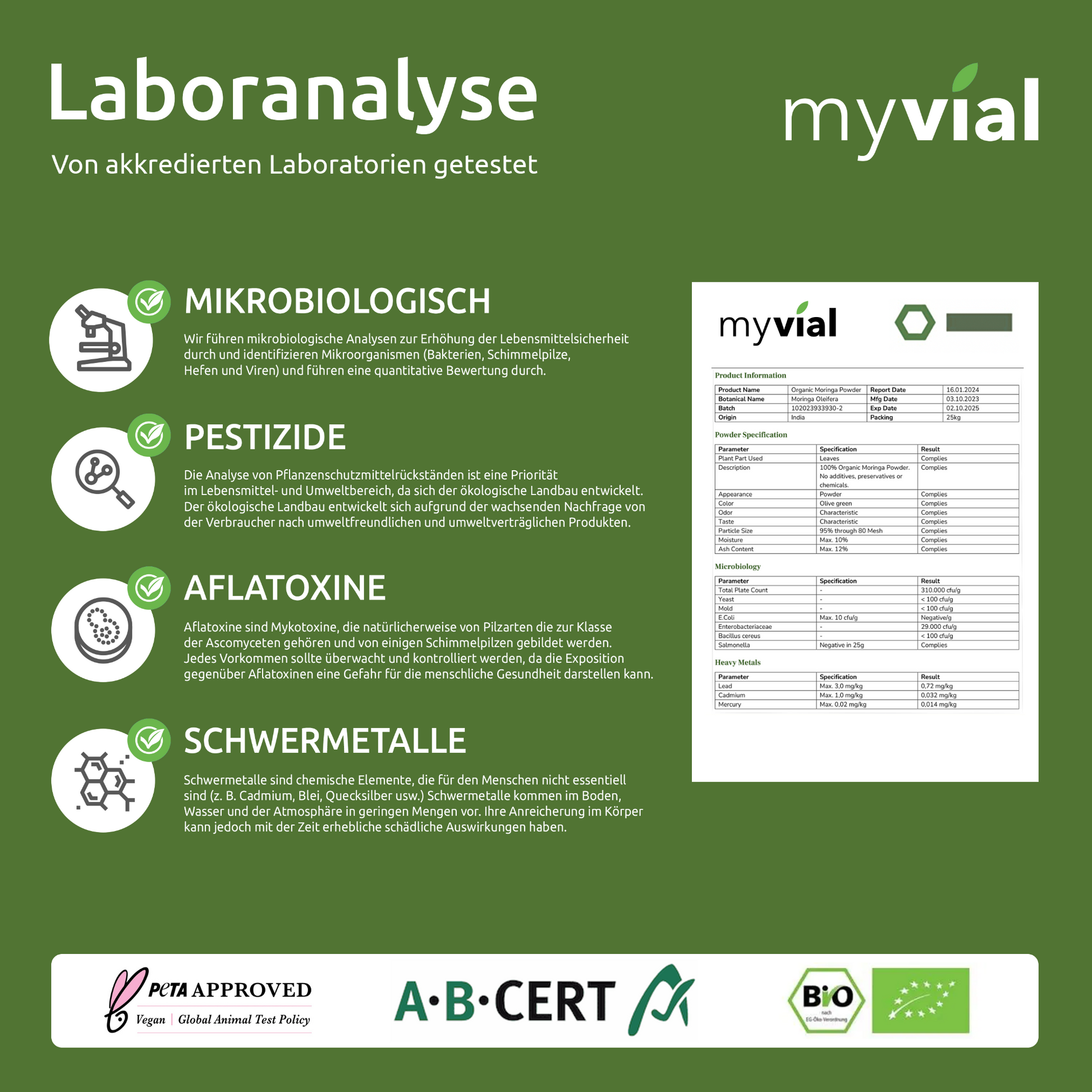 Um eine hohe Qualität zu gewährleisten, wird jeder unserer Rohstoffe von einem deutschen Labor geprüft.