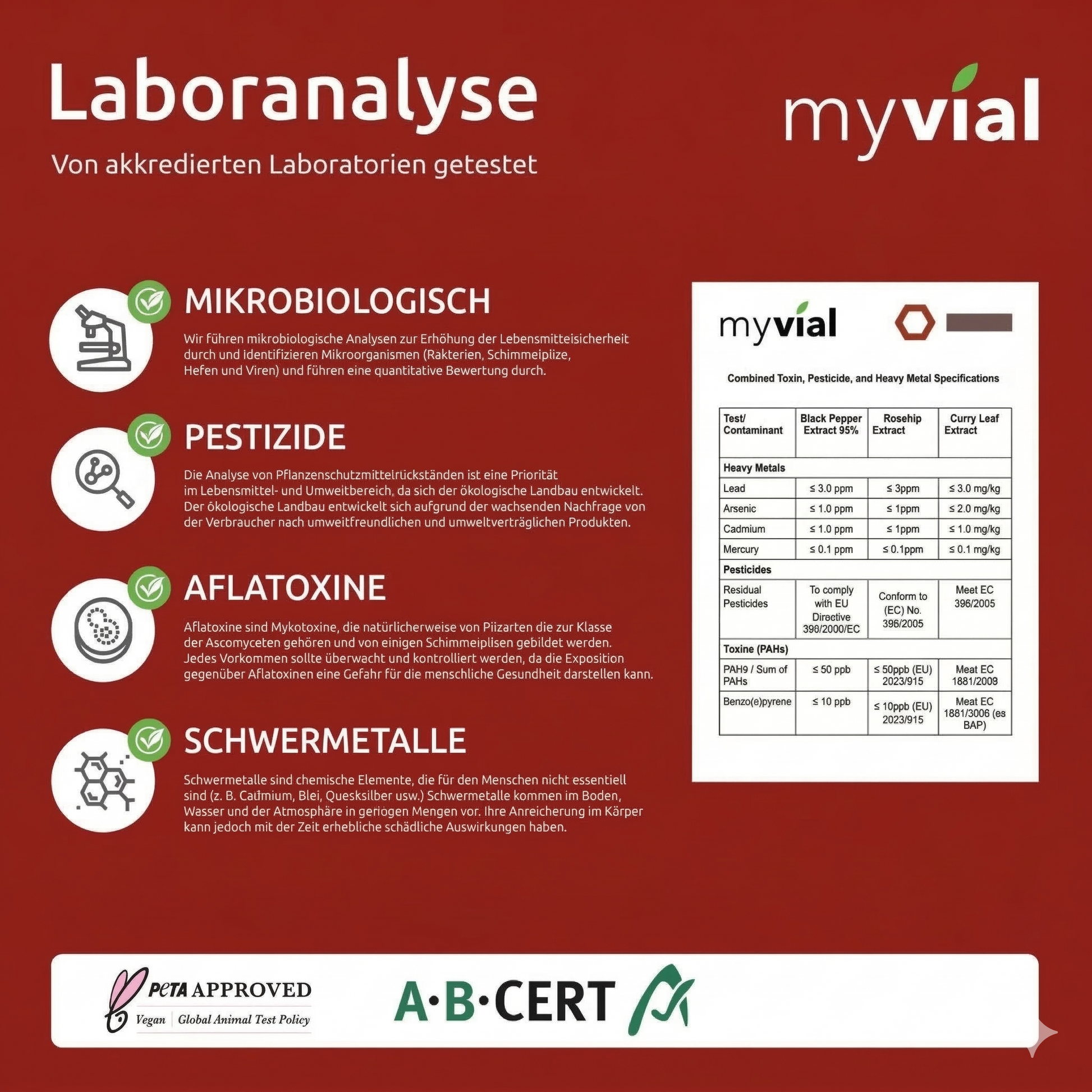 Um eine hohe Qualität zu gewährleisten, wird jeder unserer Rohstoffe von einem deutschen Labor geprüft.