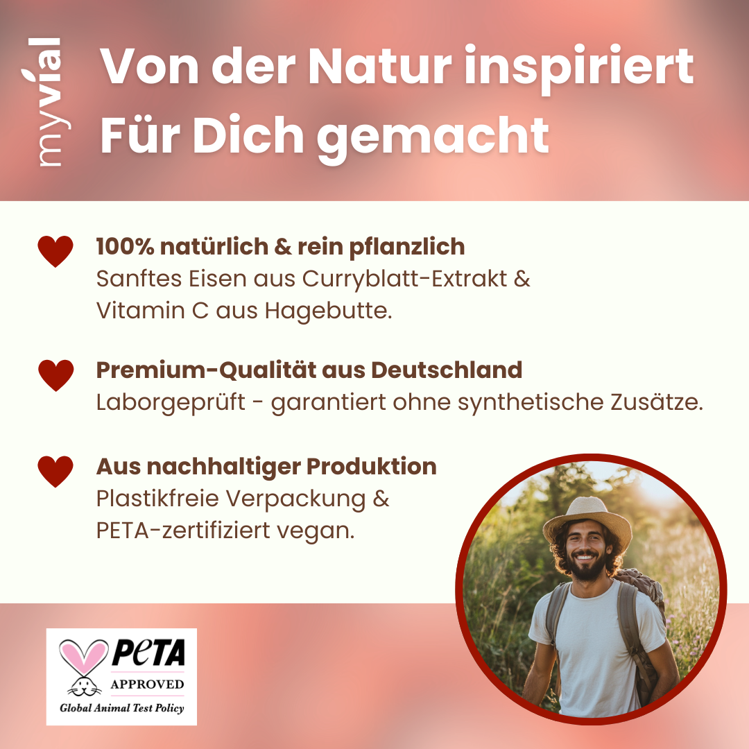 Iron is an essential trace element and an indispensable component of red blood cells. It helps transport oxygen in the body and is involved in numerous vital functions. Without sufficient iron, the body cannot optimally maintain its energy and oxygen supply. Particularly in combination with vitamin C, iron absorption in the body can be improved.