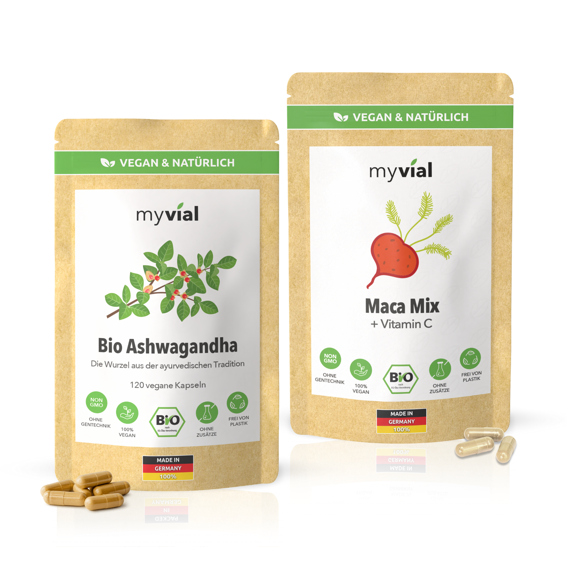 This package combines organic ashwagandha and maca mix + vitamin C. While ashwagandha has been valued in Ayurvedic tradition for centuries, the combination of maca and acerola provides a natural source of vitamin C. Together, they form a valuable supplement for anyone looking to support their balance naturally.
