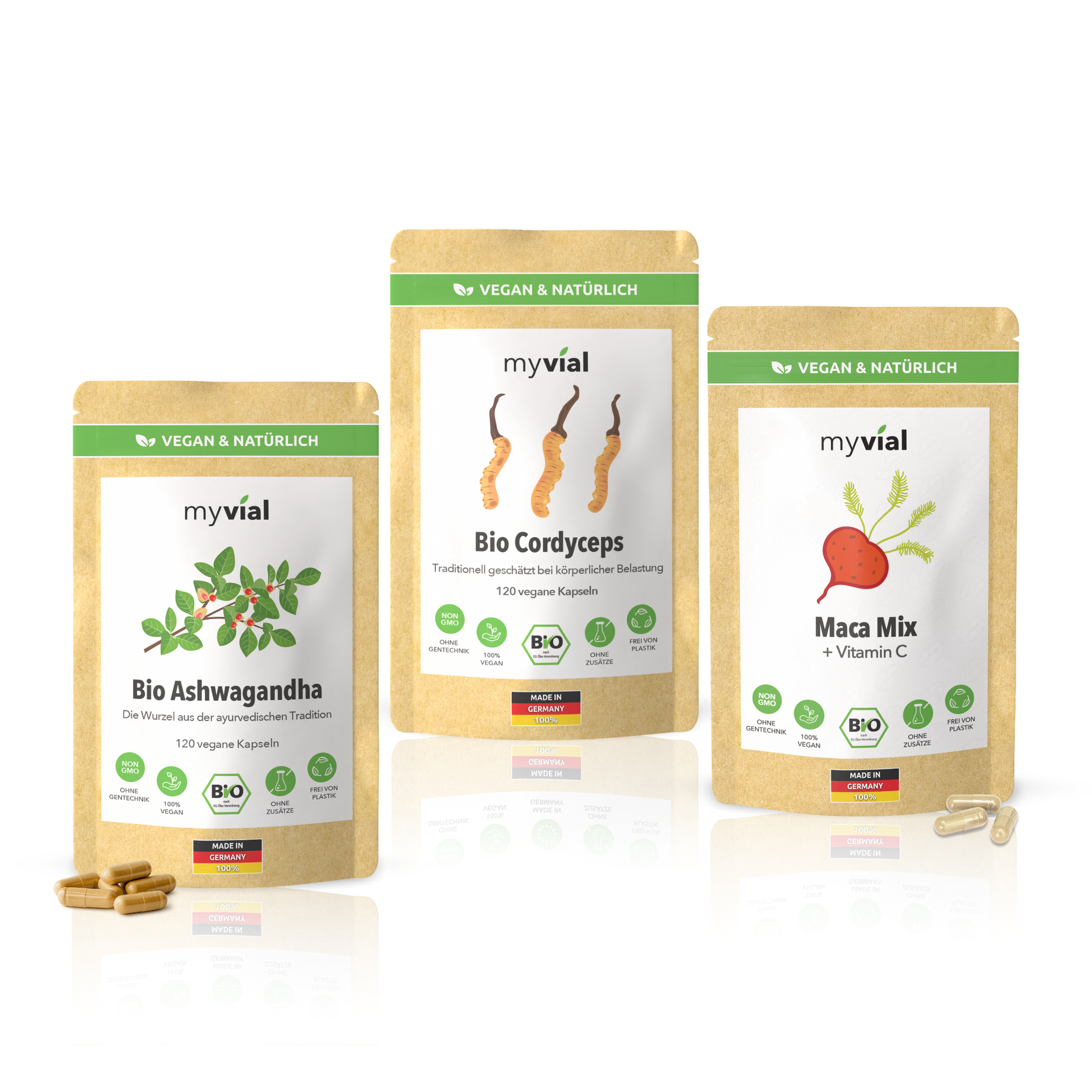 With our Fitness Package, you receive a well-thought-out combination of Maca with Vitamin C, organic Ashwagandha, and organic Cordyceps – ideal for anyone looking to consciously support their active lifestyle.